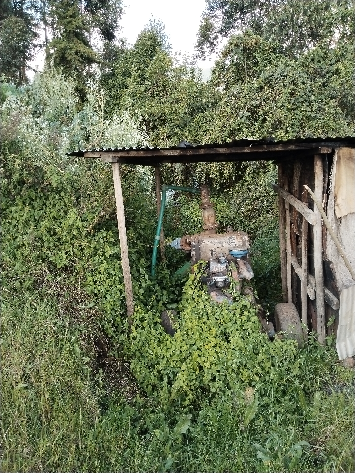 The image depicts an outdoor scene in Ndiara, Kenya, featuring a rudimentary wooden shelter with a corrugated metal roof, constructed from rough-hewn posts. Beneath this shelter, a weathered, rust-stained mechanical pump assembly, possibly engine-driven, is visible, partially obscured by dense green foliage and climbing vines. A green hose or pipe is connected to the pump. The ground surrounding the shelter and pump is heavily overgrown with tall grasses, shrubs, and leafy vegetation. In the background, a dense cluster of various trees, including tall conifers and broadleaf trees, forms a natural backdrop under a bright sky. No individuals, actions, or specific interactions are present in the frame.