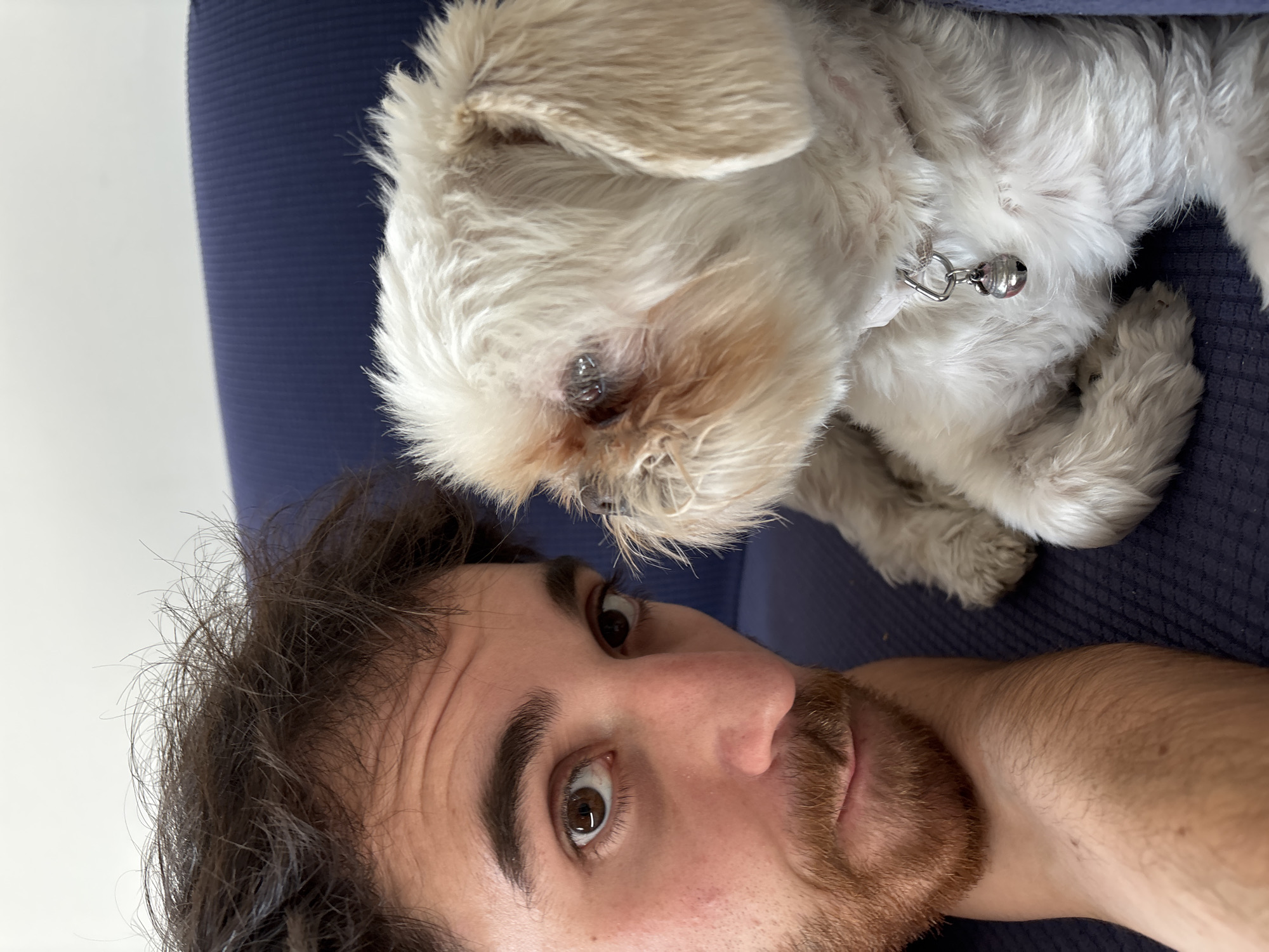 A close-up photograph depicts a male individual and a dog situated on dark blue upholstered furniture within an indoor setting in Santa Clara Ocoyucan, Mexico. The male, positioned on the left, has dark brown, disheveled hair, thick eyebrows, brown eyes, and a light brown beard and mustache. He is observed looking directly forward into the camera. His right forearm is visible, supporting his head. To the right of the male is a small, light-colored dog, likely a Shih Tzu or similar breed, with predominantly white fur and some light brown coloration around its snout and ears. The dog is partially obscured by the male's head and is looking towards the right side of the frame, away from the camera. It wears a light-colored collar with a small silver bell attached to a metal ring. Both subjects are positioned against a backdrop that transitions from a light, possibly white, upper area to the dark blue upholstery below.