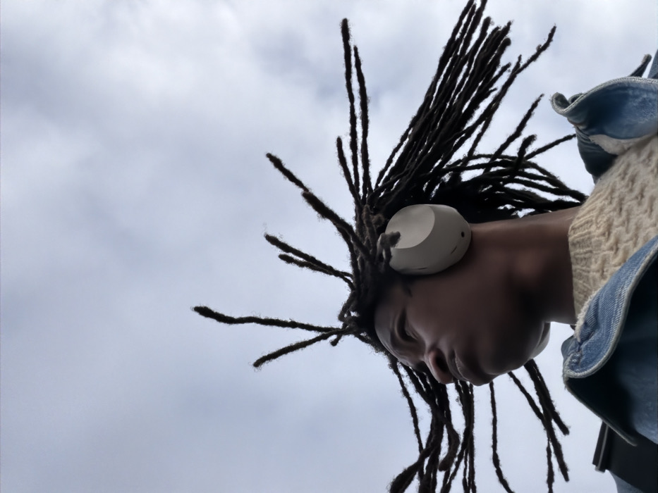 A singular individual with dark skin, appearing young, is depicted in a low-angle, profile view, facing upwards and towards the viewer's left. The subject wears dark dreadlocks, many of which extend upwards and outwards from the head. Light grey, over-ear headphones are positioned over both ears, with the right earpiece prominently visible. The subject is dressed in a textured, light-colored knitted sweater underneath a light blue denim jacket. A dark strap, possibly from a bag, is partially visible over the left shoulder. The background consists of an overcast sky with indistinct grey and white cloud formations. The scene takes place in Rosny-sous-Bois, France.