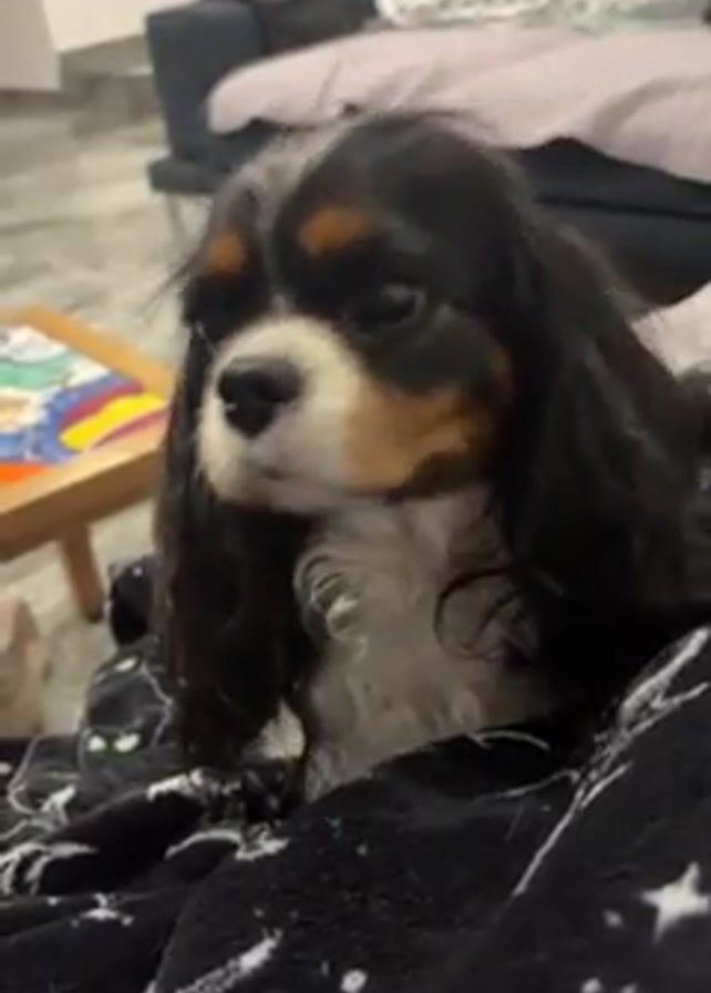 A black and tan Cavalier King Charles Spaniel is lying on a black blanket with white moons and cat eyes printed on it. The dog is looking toward the camera with a focused expression. The dog is sitting on someone's lap, presumably the person filming. In the background, there is a small wooden coffee table with colorful tiles on top and a sofa with patterned throw pillows. Voices can be heard speaking Italian in the background. The room appears to be a living room.