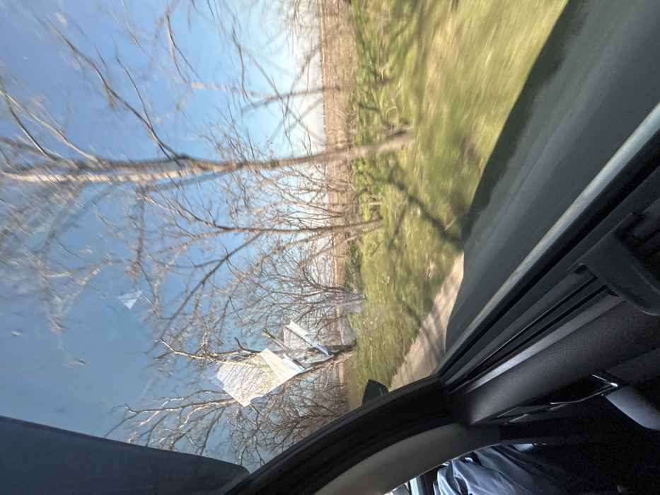 The image provides a view from the front passenger side of a moving vehicle in Vetren Dol, Bulgaria. The interior of the vehicle, including a dark gray door frame and a portion of a passenger's arm clothed in blue, is visible on the left and bottom. The vehicle's window is marked with multiple light-colored, reflective smudges or adhesive elements, including a prominent diamond shape and smaller triangular streaks. Outside the window, a dirt or unpaved road runs parallel to the vehicle's direction of travel. Adjacent to the road, a strip of vibrant green grass extends to a line of deciduous trees, mostly bare of leaves, indicating late winter or early spring. These trees cast long shadows across the grassy terrain. Beyond the trees, a large field of dry, brown vegetation or tilled earth is visible, stretching towards a distant, indistinct horizon. The sky overhead is clear and bright blue. The blurring of the exterior elements suggests the vehicle is in motion.