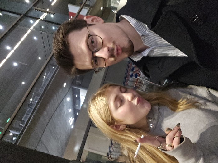 A tilted snapshot captures a man and a woman posing for the camera. The man, wearing glasses, a striped shirt, and a dark overcoat, puckers his lips. The woman, with long blonde hair and a grey sweatshirt, also puckers her lips while holding a lit cigarette. The background reveals what appears to be an airport interior with large windows and rows of luggage carts.