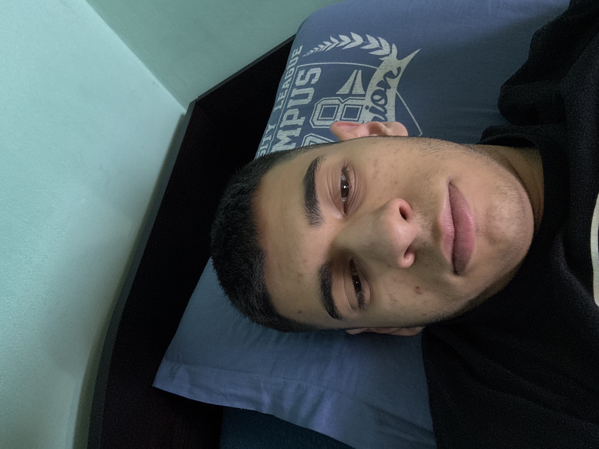 A young man lies on a pillow in a bed. He is fair-skinned with dark hair and brown eyes. He is wearing a black sweatshirt. The pillow has a blue pillowcase with white lettering. The wall in the background is light blue. The bed has a dark brown headboard. It is not possible to determine the location of the city of Sofia, Bulgaria in the image.