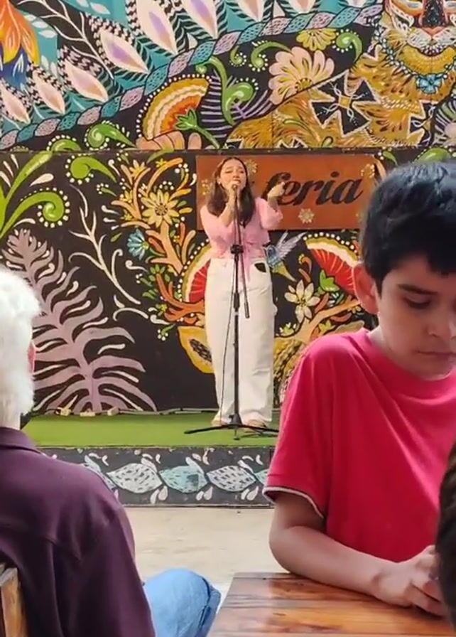 A young woman is singing at a microphone on a small stage, in what appears to be a cafe or restaurant. She's wearing a pink shirt and white pants, and gesturing with her hands. Behind her is a colorful mural with a variety of designs including floral elements and animal images. A young boy in a red shirt is sitting at a wooden table in the foreground, not looking at the performer. There are other people seated at tables, including an older person with white hair. The light is somewhat bright, suggesting it's daytime or a well-lit interior.