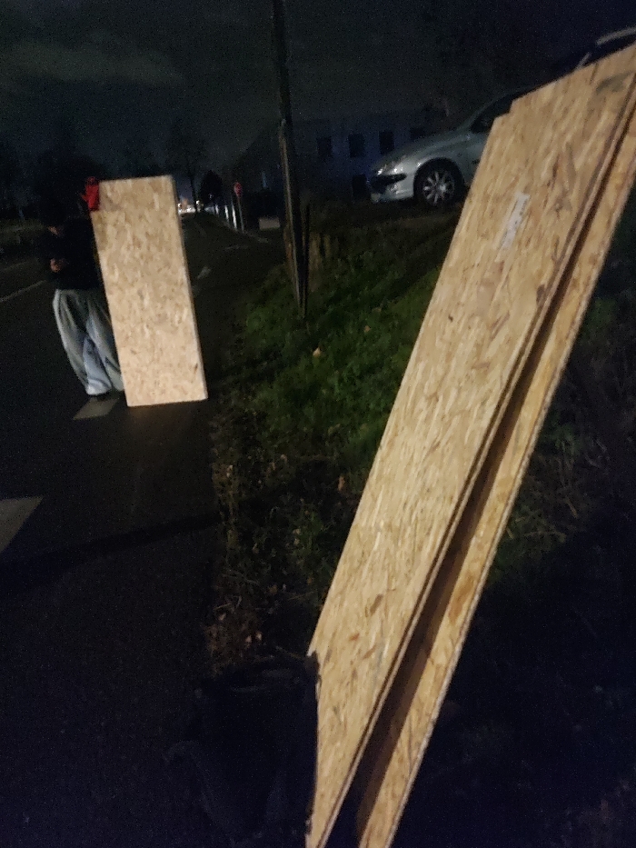 A dimly lit nighttime scene shows a person carrying a sheet of oriented strand board (OSB). Several other OSB sheets lean on the grass verge of the road. A parked silver car sits on the grass verge in the background. A streetlight is visible. The scene is dark and appears to be outdoors.