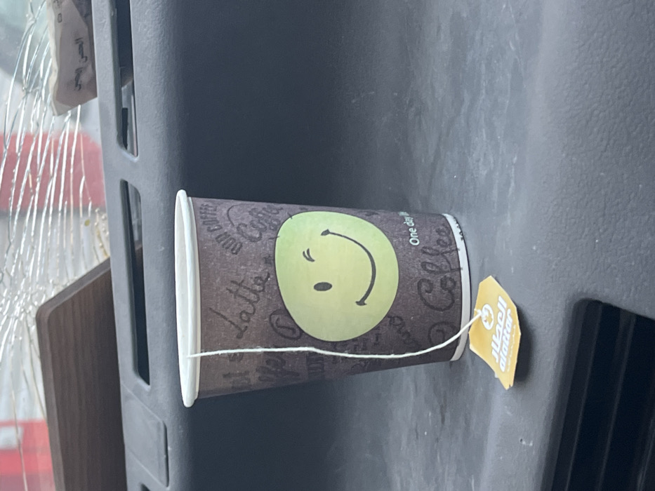 - "The image depicts a disposable paper cup and a tea bag resting on the dark grey dashboard of a vehicle" by FM-WnN6r1, licensed under CC BY 4.0