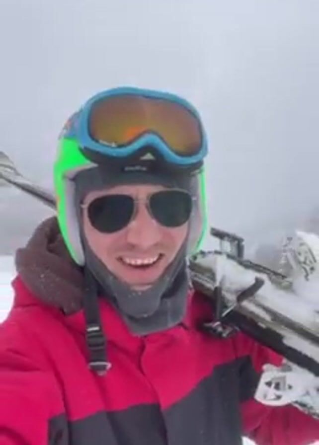 A person with light skin is shown in a selfie-style video. The person is smiling and wearing a red and black ski jacket, sunglasses, a gray neck gaiter, and a ski helmet with blue and orange goggles. They are holding skis over their shoulder. The background is a snowy landscape with trees. Snow is falling.