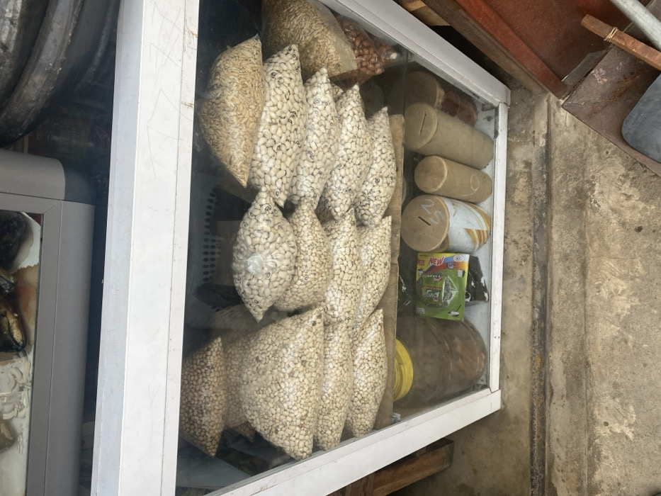 The image displays the interior of a glass-fronted display cabinet, likely within a small market stall or provision shop in Accra, Ghana. The cabinet consists of white-framed shelving units. The top visible shelf contains multiple transparent plastic bags filled with dried legumes. Specifically, approximately nine bags of white beans, identifiable as black-eyed peas due to their characteristic dark hilum, are stacked in two primary piles. To the right, another stack of three transparent bags holds light brown shelled peanuts. Additional bags containing both white beans and peanuts are visible in the background, filling the shelf. The bottom visible shelf houses various items. On the left, a large, clear plastic jar with a yellow lid contains a dark, granular substance, possibly spices or dried goods. Adjacent to it, a small packet with green and white packaging, labeled "NEW," lies flat. To the right, three cylindrical objects stand upright. The leftmost is a white and gold-painted wooden or cardboard savings box (susu box) with a money slot and "2.5" inscribed on its side. Next to it are two plain light-brown cylindrical savings boxes, also with money slots. A fourth, darker cylindrical container is partially visible on the far right. Above the cabinet, a reflective surface, possibly another shelf or appliance, shows indistinct reflections. A portion of a dark, possibly rubber or metal, circular object is visible on the upper right. The immediate foreground below the cabinet reveals a worn concrete floor with minor cracks and discoloration. A dark, flat object, possibly a mat or piece of metal, is partially visible on the bottom right, while a section of a wooden furniture leg is present on the bottom left. No individuals are visible in the scene.