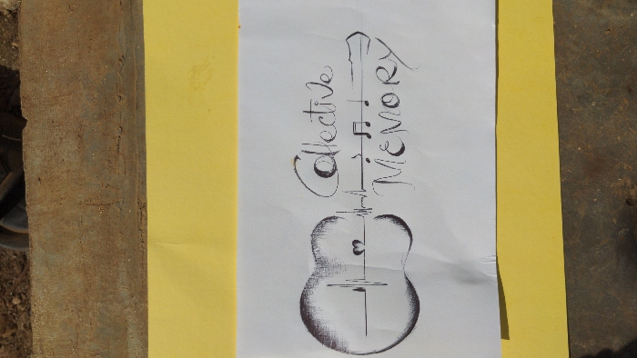 A white sheet of paper bearing a black ink drawing and text is centrally positioned on a larger piece of bright yellow paper. The white paper features a stylized acoustic guitar body on the left, from which an electrocardiogram (ECG) waveform extends horizontally, transforming into musical notes (two beamed eighth notes), and concluding as a pointed guitar neck shape on the right. Above this central waveform, the cursive word "Collective" is written, and below it, the cursive word "Memory" appears. The yellow paper is situated on a rough, earthy, brown-grey ground surface, which exhibits cracks and dust. A dark, indistinct object is partially visible in the upper background, beyond the ground. The scene is illuminated by natural light, casting minimal shadows. This scene is located in Longuo 'A', Tanzania.