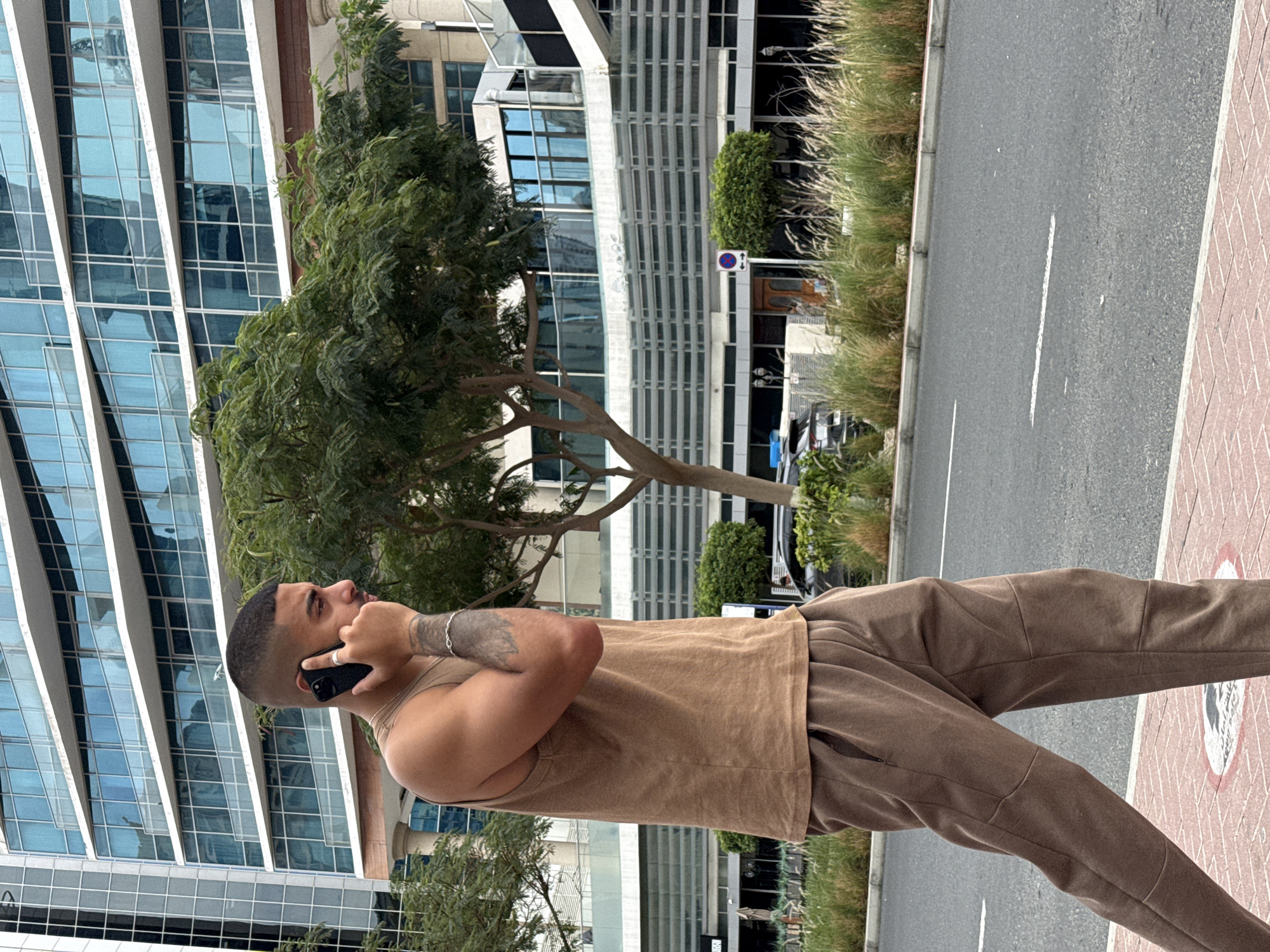 A man is standing on a red-brick sidewalk beside a grey asphalt road in a city. He is holding a black smartphone up to his ear with his left hand, and his right arm is across his chest. The man is wearing a brown tank top and brown pants. A tree stands beside him on the sidewalk. Behind the sidewalk and tree are low bushes, then the grey asphalt road with a white line in the center, then more bushes and a grey building with multiple glass windows. There is a small parked car behind the bushes. The photograph was taken in the city of Dubai, United Arab Emirates.