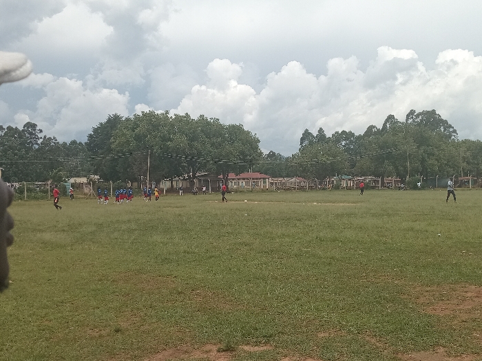 This image depicts a wide-angle view of a large, open grassy field under a heavily clouded sky in Chevaywa ward, Kenya. The foreground consists of uneven green grass, with a partial view of a hand or finger visible in the upper left corner of the frame. In the midground, a group of approximately 10-12 individuals, appearing to be young adults or children, are gathered on the left side of the field. Several wear red shirts, while others are in blue and yellow attire. One individual in a red shirt is in motion, moving towards the left. Further to the right in the midground, a solitary individual in a red shirt is positioned centrally, facing right. Another individual in a light-colored shirt and dark pants stands towards the far right, with arms slightly raised. The background features a dense horizontal line of green trees, approximately 8-10 meters tall, separating the field from various single-story buildings. Visible structures include buildings with distinct red-tiled roofs and other lighter-colored buildings, suggesting a mix of residential or institutional architecture. Utility poles and overhead lines span horizontally across the background, situated above the tree line and structures. The overall scene suggests an outdoor gathering or activity, possibly a sports game, on the large field.