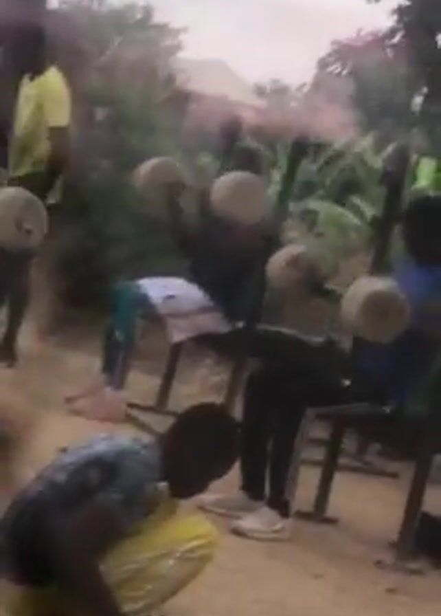 group of young Black men working out outdoors in what appears to be an open gym space. They are using weights and benches. The area is dusty, and trees surround the gym. A mountain can be seen in the distance. The men appear to be engaged in various exercises, with some lifting weights while others are resting. They are all wearing casual clothing. The lighting is somewhat overcast.