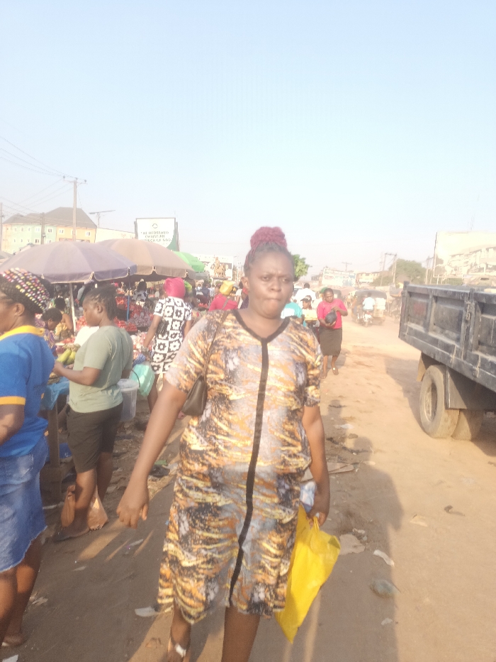 In an outdoor market scene, a woman in a patterned dress stands facing forward, holding a yellow plastic bag