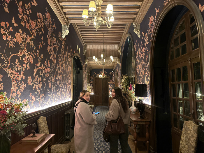 Two women stand in a dimly lit, opulent hallway adorned with dark floral wallpaper and wood paneling
