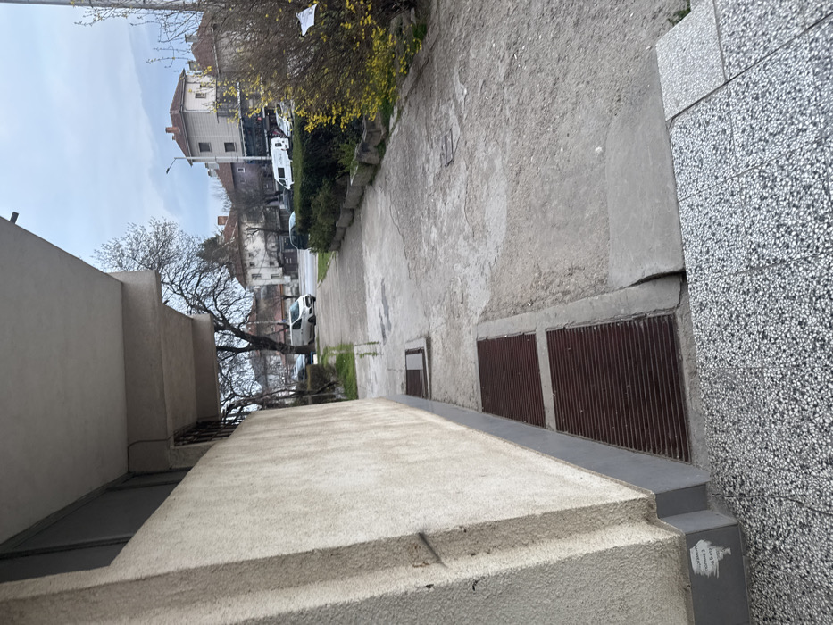 The image depicts an exterior sidewalk scene at ul. "Bacho Kiro" 19, 1000 Sofia Center, Sofia, Bulgaria, adjacent to what appears to be a sports complex. On the left, a light-colored, textured stucco wall extends vertically from the foreground, exhibiting visible staining and wear. A dark grey trim runs along its base. Two large, dark brown metal grates are set into the ground parallel to the wall, followed by a smaller square grate further along the sidewalk. The immediate foreground ground consists of grey and white speckled terrazzo tiles, forming a slight step. A concrete sidewalk, showing cracks and uneven patches, extends from the foreground into the midground. Small patches of green vegetation, including grass and weeds, are present in the sidewalk cracks and along its edges. To the right of the sidewalk, a row of low, trimmed green hedges is planted within concrete planters or a raised bed. Beyond the hedges, a cluster of deciduous bushes with bright yellow blossoms is visible. In the background, a paved street runs horizontally, populated by several vehicles. A white commercial van is prominently parked on the left side of the street, facing away from the viewer. Other vehicles, including another white van and a dark sedan, are visible further down the street. The street is bordered by multi-story buildings with light-colored facades and reddish-brown tiled roofs. Several bare-branched deciduous trees are scattered throughout the background. The sky overhead is overcast and grey. A street light pole is visible in the distant background. No individuals are present in the scene.
