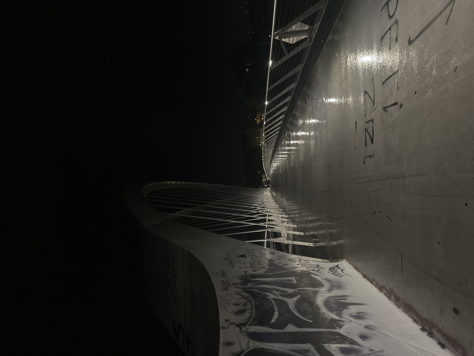 The image depicts a nighttime scene on the Passerelle des Deux Rives (Bridge of Two Shores) in Kehl, Germany. The bridge's pedestrian and cyclist path is wet, reflecting multiple light sources from fixtures positioned along the right-hand railing and likely overhead. To the left, a prominent, curved white concrete arch supports the bridge deck. The lower section of this arch and an adjacent concrete retaining wall are extensively covered in black and purple spray-painted graffiti. White suspension cables are visible descending from the arch to connect with the bridge deck. The right side of the bridge features a metal railing constructed with horizontal bars and diagonal cables. The light grey bridge surface shows additional black spray-painted text, with partially discernible letters "PETRI" and "ZIZI" visible in the foreground. In the distance, a solitary, indistinct individual is discernible walking away from the camera, positioned centrally on the bridge. The immediate environment is dark, with minimal distant illumination from beyond the bridge structure. No other specific subjects or objects are clearly identifiable.
