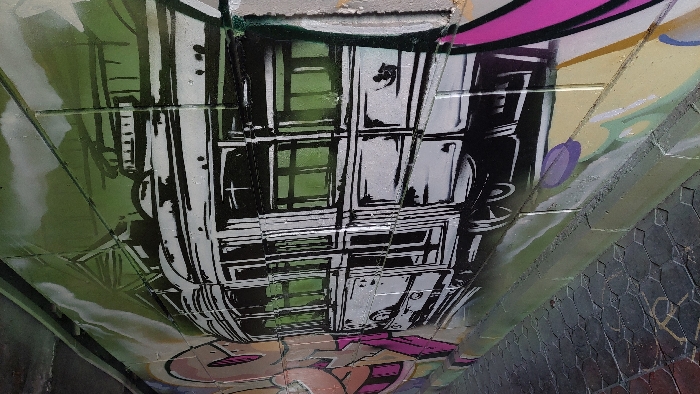 The image displays a section of a graffiti mural on a textured wall within a dimly lit urban underpass, location Unknown, Unknown