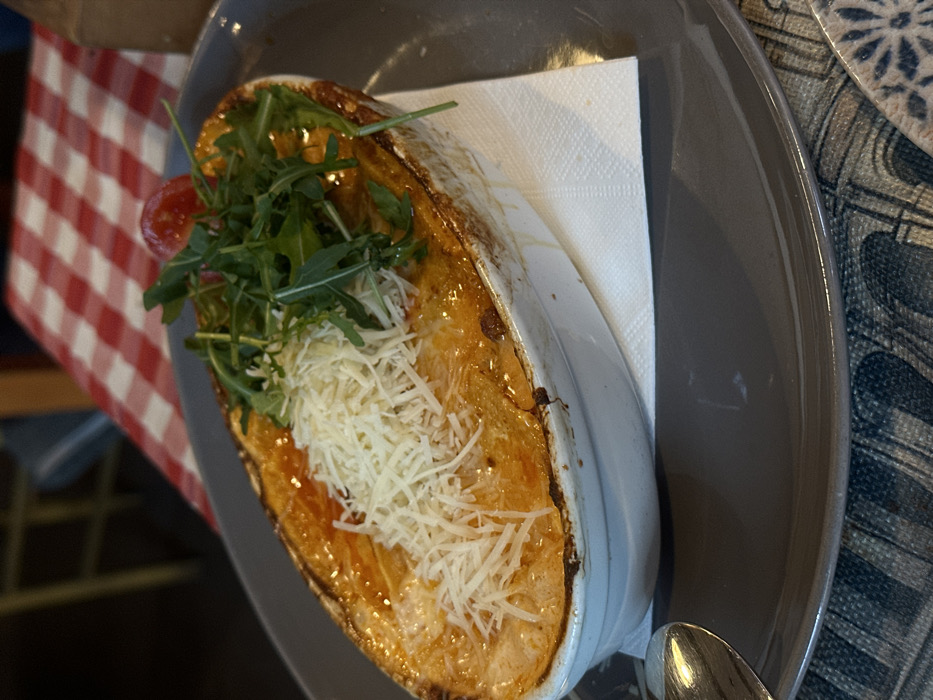 - "An oval white ceramic baking dish containing a baked pasta dish, likely lasagna, is positioned centrally on a round, dark grey ceramic dinner plate" by FM-cVWYb2, licensed under CC BY 4.0
