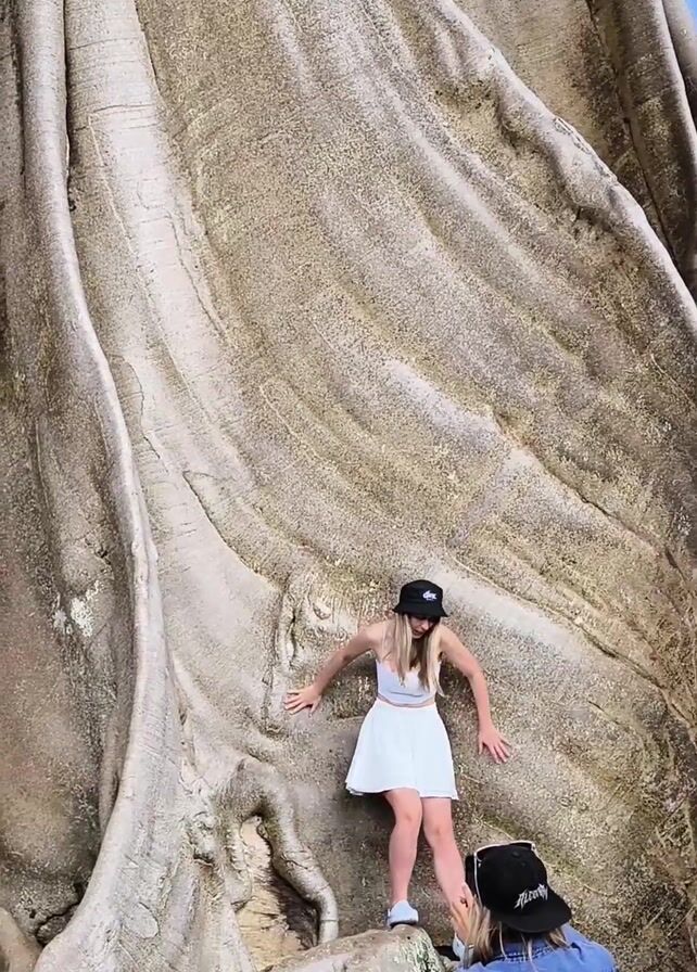 A young woman stands on a large, gnarled tree trunk, posing for a photo taken by another person