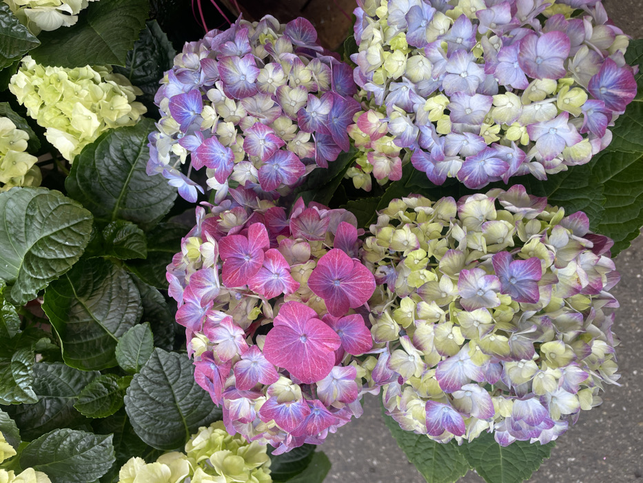 The image presents a close-up, overhead perspective of multiple blooming hydrangea plants arranged densely. Several spherical flower heads dominate the frame, exhibiting a varied color palette: prominent fuchsia-pink, shades of purple and blue, and light green-yellow, often transitioning within individual florets or clusters. Each flower head comprises numerous small florets. Lush, dark green, lobed leaves of the hydrangeas are visible interspersed among and beneath the blossoms. A light gray, textured surface, consistent with pavement or concrete, is partially visible in the lower left quadrant of the frame, indicating an outdoor or market setting. The background is otherwise obscured by foliage and shadows. No individuals or specific actions are depicted. The precise location within Strasbourg, France, is not discernable from the visual content provided.