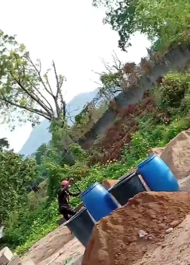 construction site. In the first shot, a blue three-wheeled vehicle is parked near a pile of dirt. The second shot shows a person in a red hat and dark clothes carrying a black tub up a hill next to a stack of concrete blocks. The final shots display a dirt and grass covered ground with some small pieces of trash scattered about.