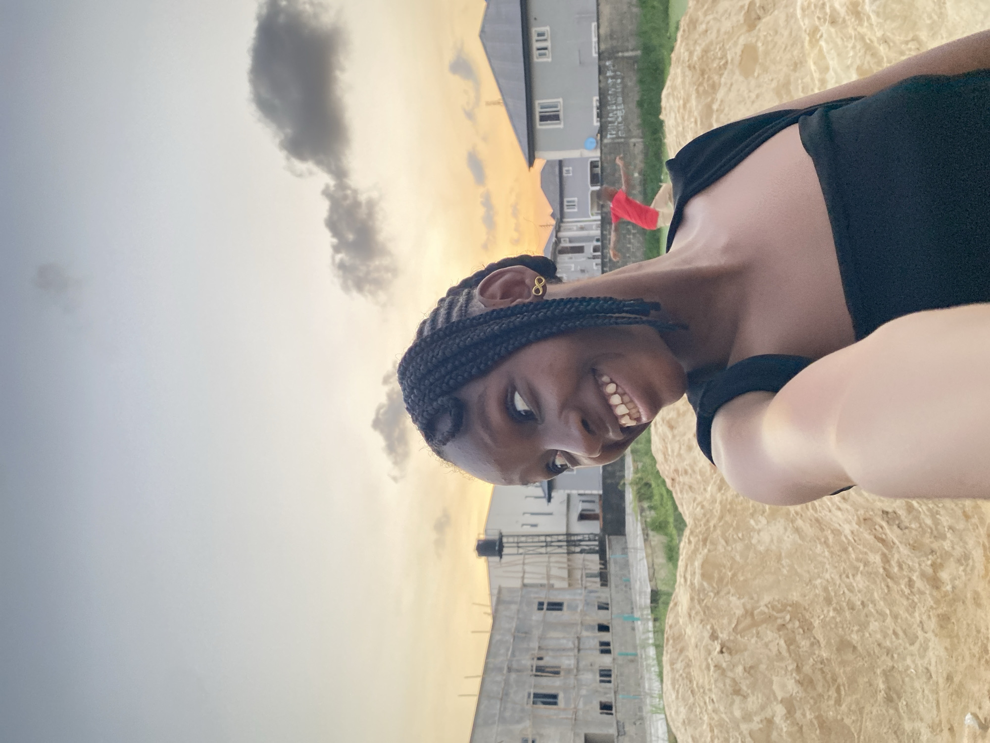 A young person with dark skin, braided hair, and a gold infinity symbol earring in their right ear, wears a black sleeveless top and smiles broadly while looking towards the upper right. Their right arm is partially visible on the left side of the frame. They are positioned in the foreground directly in front of a substantial pile of light brown sand. In the midground, a child in a red t-shirt and light-colored shorts is captured in motion with arms extended, behind a low concrete wall and a patch of green vegetation. The background depicts a residential area in Iranla, Nigeria, featuring a multi-story building under construction with exposed concrete and framed windows, a dark water tank on a tall metal stand, and several completed light grey and white residential houses with dark roofs. The sky, indicating either sunrise or sunset, displays hues of light blue, orange, and yellow with scattered grey clouds.