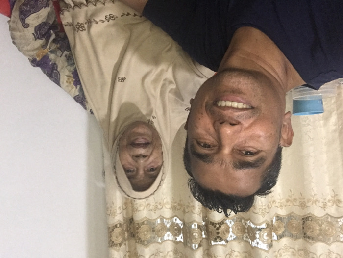 An indoor selfie depicts a middle-aged man and an elderly woman