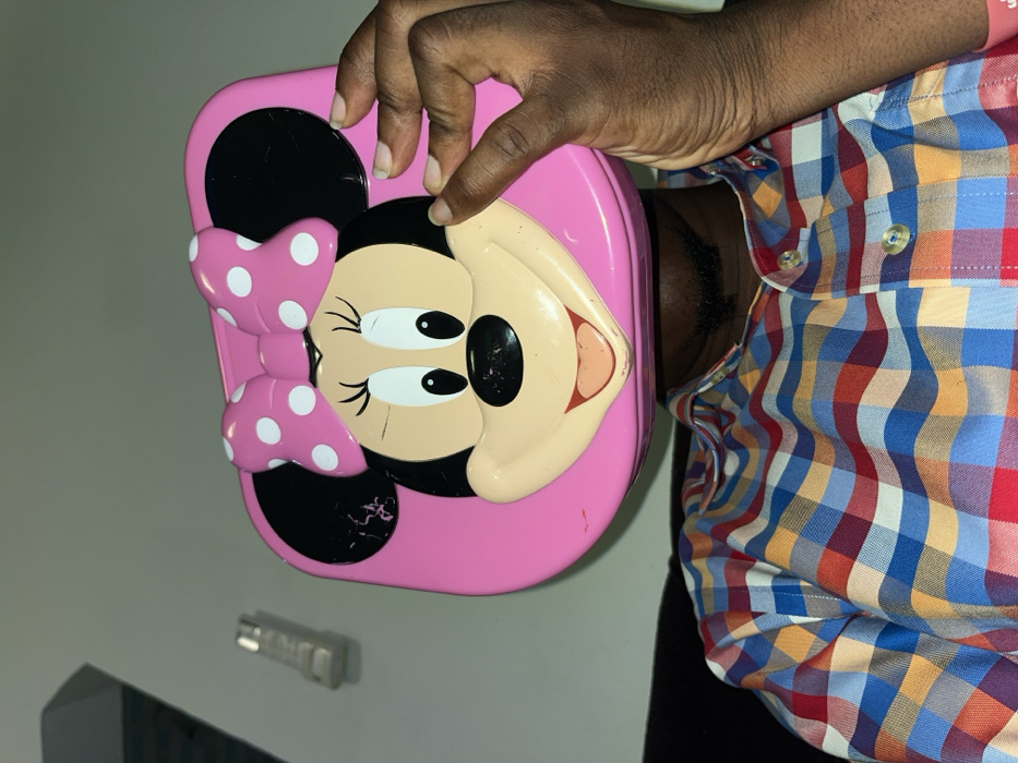 A man in a colorful plaid shirt holds a pink Minnie Mouse lunchbox. The lunchbox has a 3D Minnie Mouse face with a polka-dotted bow. Cracks are visible near the left ear of the Minnie Mouse design. The man's fingers are positioned on the top of the lunchbox near Minnie Mouse's face. The background is a plain light-colored wall, with a glimpse of a dark object in the bottom left corner.