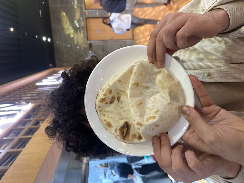 This image captures an indoor scene within a restaurant or eatery located in Noyelles-Godault, France. In the foreground, a person with dark, curly hair holds a white, round ceramic plate, obscuring their face from the bridge of the nose upwards. The individual's hands, with manicured but unpolished nails, grip the plate. They wear a light-beige or cream-colored corduroy collared shirt over a lighter, possibly tan, undershirt. On the plate rests a single piece of flatbread, likely pita or naan, which is light brown with scattered darker, charred spots and appears somewhat deflated. The background is divided. To the immediate left, a kitchen or food preparation area is visible, featuring stainless steel surfaces and a staff member in a black uniform and white head covering, partially obscured, facing away from the camera. Red and green indicator lights are present on a wall. To the right, a public dining or common area is discernible, with two out-of-focus individuals. One person, in a white top and light pants, walks towards the right. Another individual with a receding hairline, wearing a dark top and light pants, stands further right. The floor in this area is light-colored wood or laminate. The walls are composed of dark, reflective panels, and two light-colored wooden doors are present on the far right. The ceiling is dark, featuring recessed lighting. A wooden decorative structure with vertical slats and illuminated signage, partially displaying characters like 'UN' or 'JLN', is visible in the upper background.