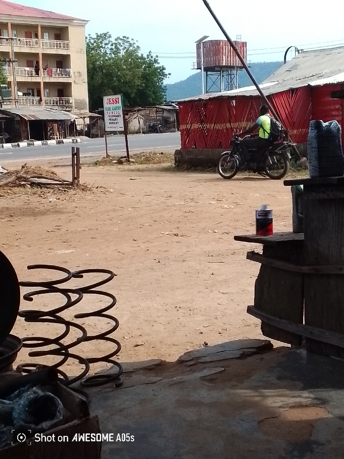 This image depicts a semi-urban roadside scene in Adankolo, Nigeria, viewed from a slightly elevated, shaded position. In the immediate foreground, a concrete floor transitions to a dusty dirt ground. On the left, several large, dark metal coil springs are stacked, with additional metallic debris visible in a container. On the right, a rudimentary wooden structure serves as a shelf, holding a red and black cylindrical can. The midground is dominated by an unpaved dirt path leading to a two-lane paved road. A white signboard, supported by two metal posts, is positioned to the left of the dirt path, displaying text that includes "JESSI ACADEMY SCHOOL SECONDARY PRIMARY NURSERY". To the right of the dirt path, a lone individual wearing a bright yellow-green vest and a dark backpack is seated on a dark motorcycle, facing away from the viewer. Beyond the paved road, various structures are visible. To the left, a multi-story light-colored building with balconies and laundry hanging is prominent, flanked by smaller, dilapidated single-story structures with corrugated roofs. To the right, a building with a distinctive red facade, featuring a chevron or woven pattern, stands. Behind this red building, a metal-framed water tower with a rusty cylindrical tank and a small solar panel on top is visible against the horizon. The background features dense green trees and a distant mountain range under a clear sky. The overall scene suggests a functional, possibly commercial or industrial, area alongside a public thoroughfare.