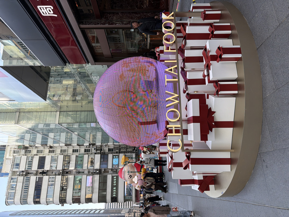 A street-level view shows a cityscape with a large spherical screen emitting light. In front of the sphere is a display of white gift boxes with red ribbons, arranged in a tiered fashion. The words "CHOW TAI FOOK" are written vertically beside the boxes. People are walking on the street in front of the display, and buildings are visible in the background.