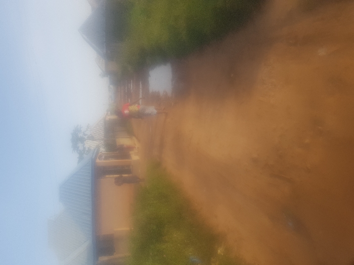 The image depicts a hazy, unpaved reddish-brown dirt road in Jos, Nigeria, extending into the midground