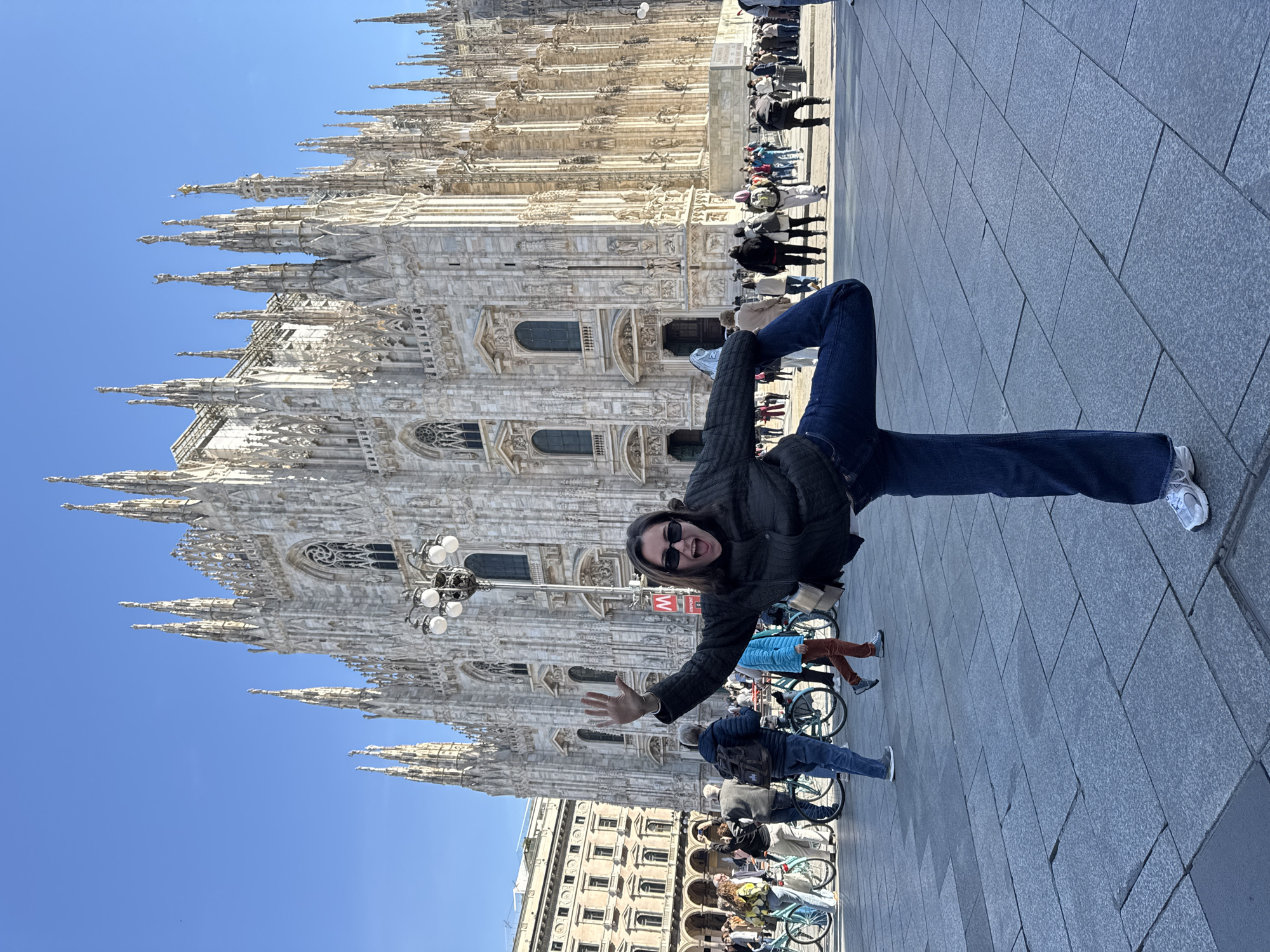 The image depicts a crowded public square in Milan, Italy, specifically Piazza del Duomo, with the Duomo di Milano (Milan Cathedral) occupying the background. A female subject is positioned in the central foreground, engaging directly with the camera. She is seen performing a dynamic pose, with her left leg bent at the knee and raised behind her, balanced on her right leg. Her right arm is raised and bent, with her open palm facing the camera in a waving gesture. Her mouth is open, suggesting a shout or laugh, and she is wearing dark sunglasses, obscuring her eyes. She is dressed in a dark, possibly quilted, jacket, dark blue jeans, and white sneakers, with a small, light-colored shoulder bag visible. Behind the central subject, the magnificent white marble facade of the Duomo di Milano dominates the scene, showcasing its intricate Gothic architecture, numerous spires, and sculpted details under a clear blue sky. A multi-globed street lamp stands between the subject and the cathedral, slightly to the right of the subject's head. To the left, a traditional building with arched windows is partially visible. The ground is paved with large, grey rectangular tiles. The square is populated by numerous other individuals in the mid-ground and far distance, engaged in various activities such as walking, standing, and observing. Several light blue shared bicycles are visible on the left side of the frame, near groups of people. A red "M" sign, indicating a subway entrance, is partially visible near the base of the street lamp. The scene is brightly illuminated by natural sunlight, casting minimal shadows.