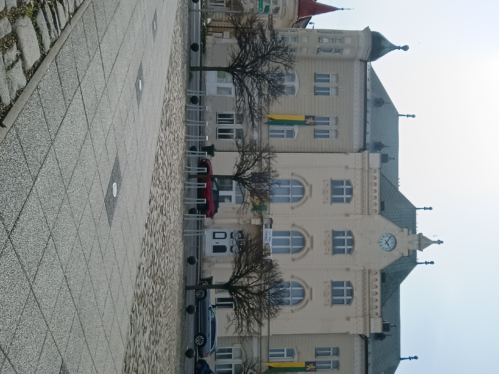 The image captures the Mestský úrad (Town Hall) building in Levice, Slovakia, viewed from a slightly elevated perspective under an overcast sky. The multi-story building features a light-colored facade with a prominent central section exhibiting a gabled roof peak containing a large circular clock face. The dark, pitched roof is adorned with several decorative finials. To the left, an octagonal tower with a dark, dome-shaped spire rises. The building displays numerous rectangular and arched windows with white frames. Two vertical flags, yellow and green with a central emblem featuring a lion or griffin, hang from the facade – one on the left section and one on the right section. A central entrance is visible, with "Levice" clearly legible on a banner above it. In the middle ground, a paved street runs parallel to the building. Parked or moving vehicles include a red SUV on the left, a dark grey station wagon, and a blue sedan on the right. Three leafless deciduous trees with dark, bare branches are positioned between the street and the building. The foreground features two distinct paving patterns. Closest to the viewer are light grey square concrete slabs with circular light-colored inlays. This transitions to a darker, irregularly textured cobblestone-like paving closer to the street. A series of dark spherical bollards and several light-colored vertical metal posts, likely bicycle racks, are arrayed between the paved foreground and the street. No individuals are present in the scene.
