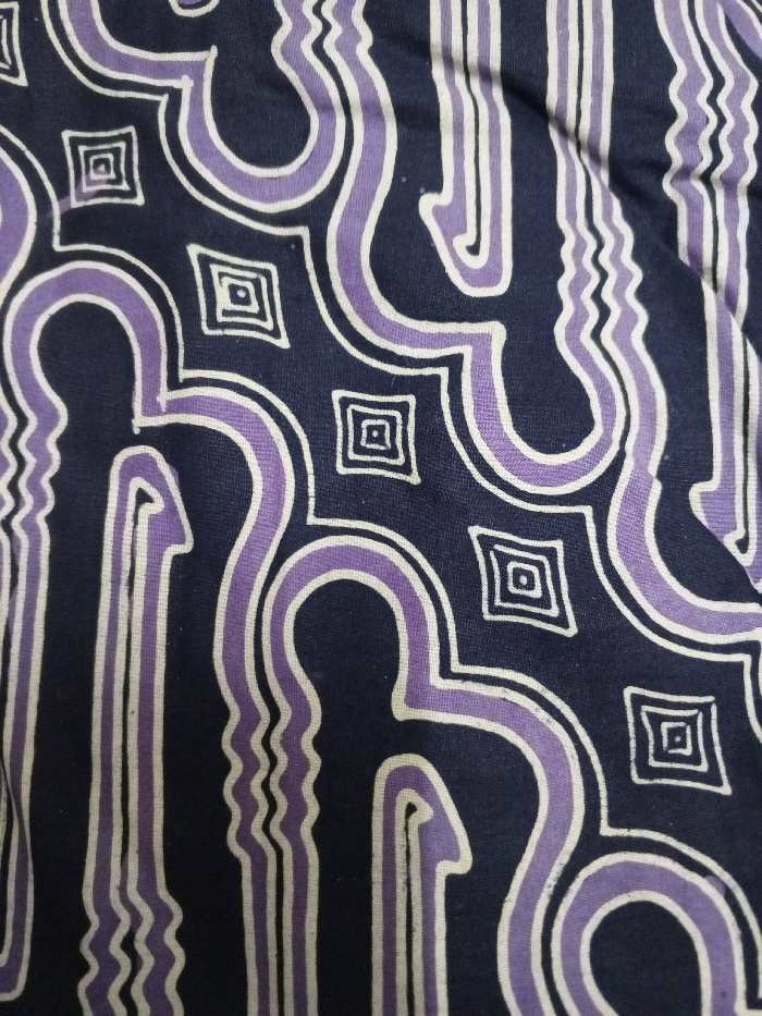 The image showcases a fabric with a dark blue background patterned with geometric shapes and stylized wavy lines. These elements are rendered in purple and white, creating a striking contrast. The design features repeating square motifs and elongated, organic forms resembling abstract figures or symbols. The overall effect is visually engaging, suggesting a traditional or cultural textile design.