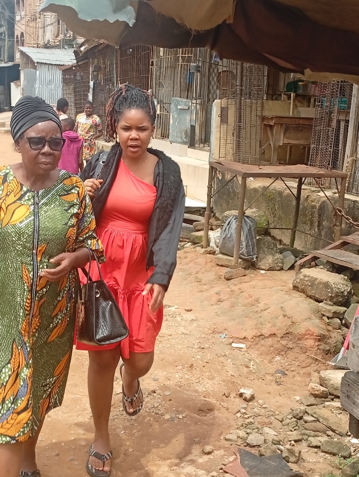 The image portrays two women walking on an unpaved, reddish-brown dirt path in Umuode, Nigeria