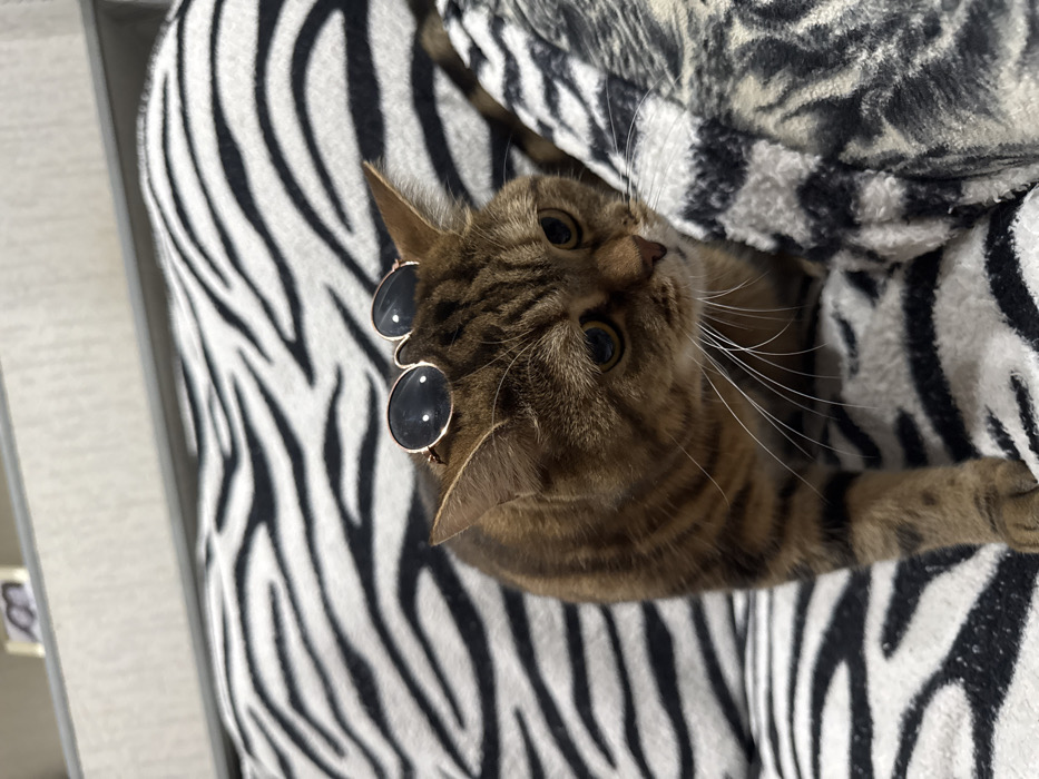 A brown tabby cat with stripes lies on a zebra-patterned surface, its body curved toward the viewer. The cat wears round, dark-lensed sunglasses perched on its head. The feline gazes upward with wide, curious eyes. Its white whiskers extend to the side, adding to its charming expression. The zebra pattern creates a bold, contrasting backdrop, highlighting the cat's unique appearance.