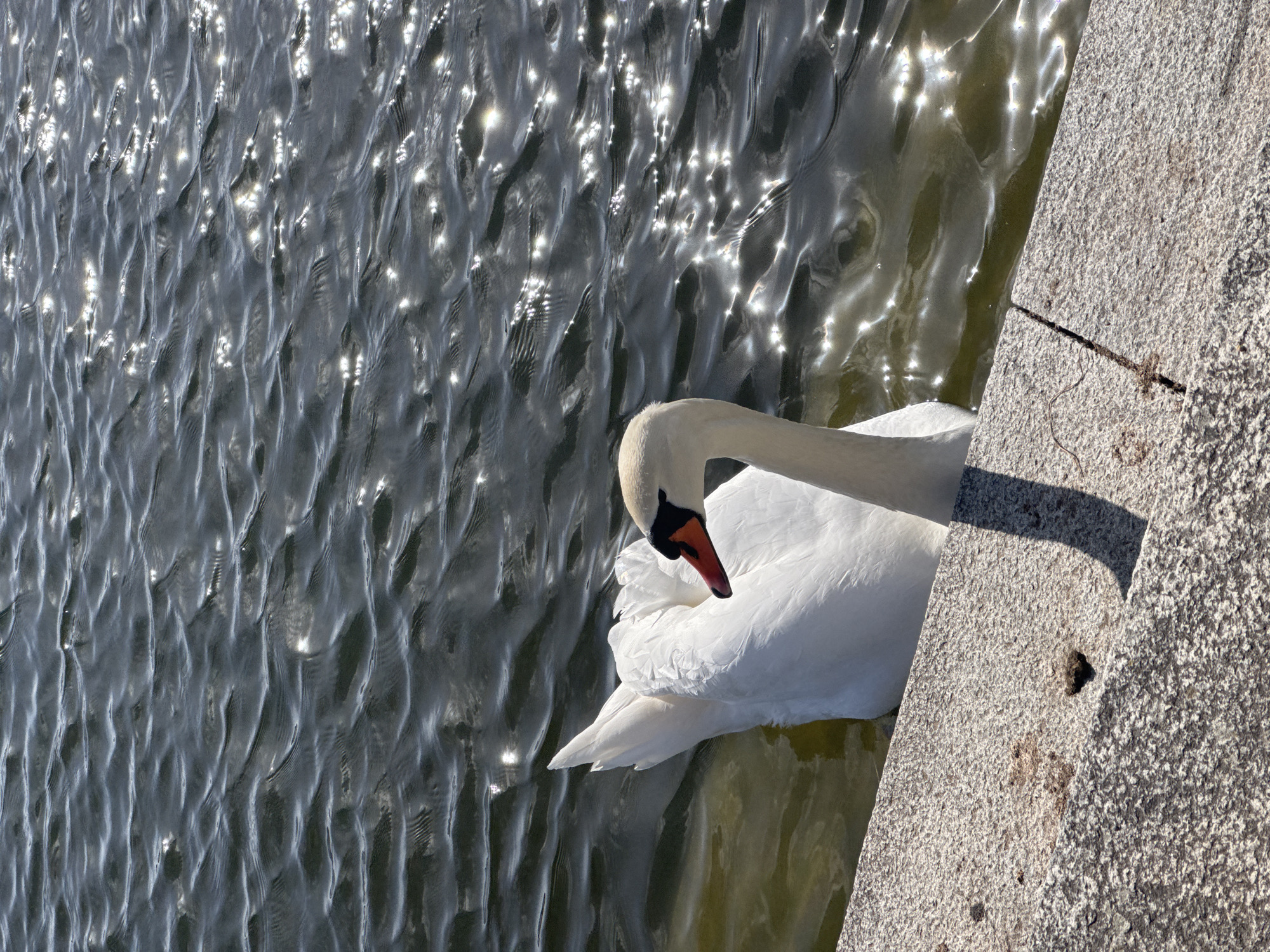 - "A white swan is resting near the edge of a body of water, possibly a canal, in an urban environment" by FM-FtAbd2, licensed under CC BY 4.0