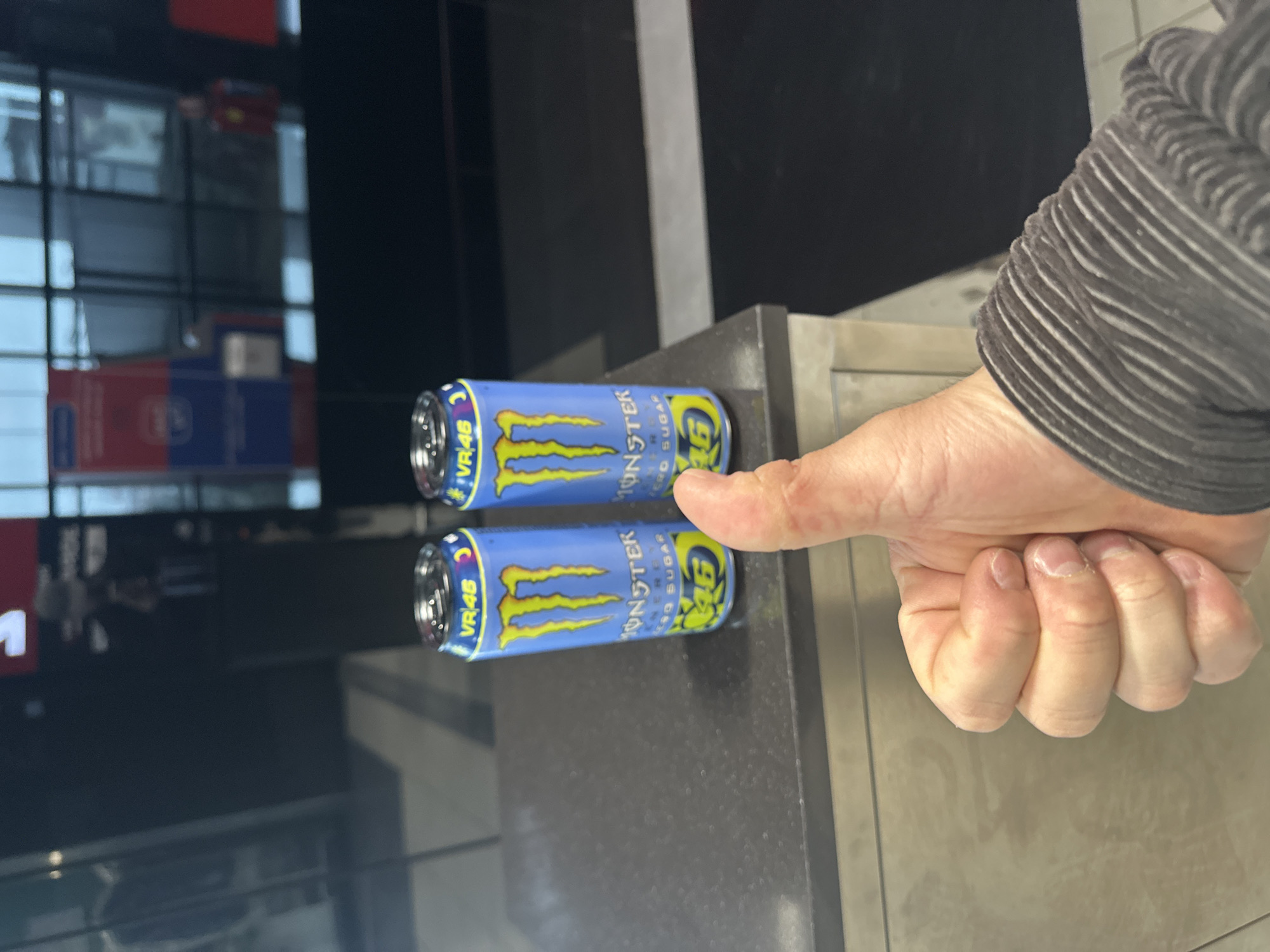 The scene is captured indoors in Sofia, Bulgaria. In the immediate foreground, a human right hand, oriented palm-in, extends from the lower right and displays a "thumbs-up" gesture. The hand shows natural skin texture and unmanicured nails. A dark grey, horizontally ribbed sleeve covers the wrist and forearm. In the mid-ground, two identical, unopened Monster Energy "VR46 ZERO SUGAR" cans stand upright on a dark grey, speckled countertop. Both cans are light blue with yellow branding, including the Monster claw logo and "VR46" text. The can on the left is positioned slightly forward of the can on the right. Below the countertop is a light-colored, possibly metallic, panel. The background is out of focus, dominated by large glass panels revealing a blurred, modern interior or exterior space. Indistinct human figures are visible through the glass, along with dark, possibly tiled, floor areas and an extremely blurry red and blue rectangular sign on the left.