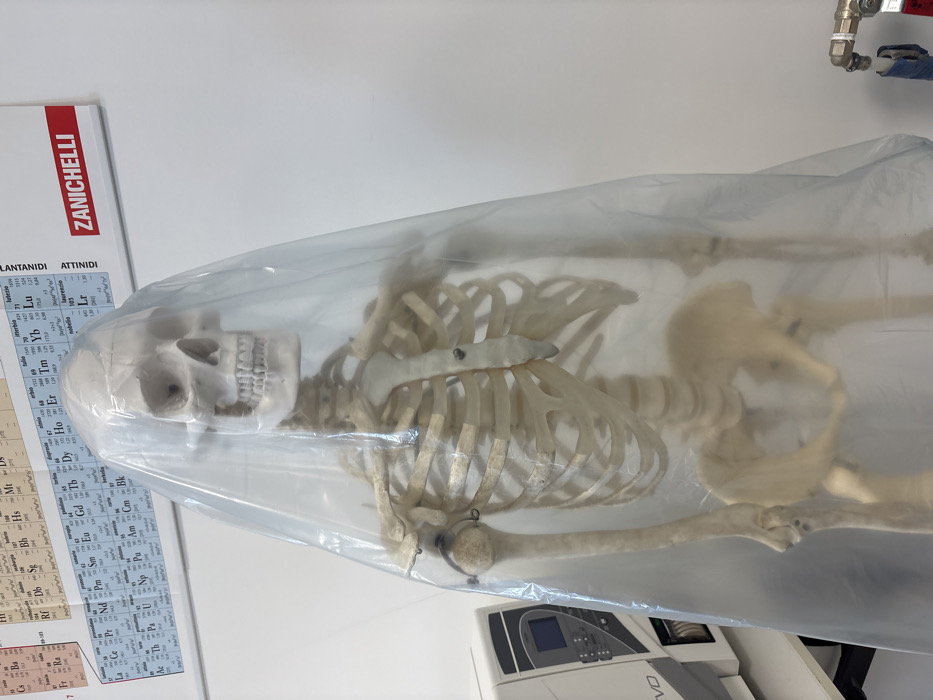 The image depicts an interior scene within an educational or scientific facility located in Foligno, Italy. The primary subject is an articulated human skeleton model, light beige in color, standing upright and largely obscured by a translucent, light blue-grey plastic sheet draped over its head and upper torso, extending down to the pelvis. Visible through the plastic, the skeleton displays detailed bone structures, including the skull, rib cage, and pelvic girdle, with small metallic fasteners at some joints. In the upper background, a large, multicolored periodic table of elements poster, featuring Italian text, is affixed to a white wall. Above this poster, a red banner with the white text "ZANICHELLI" is visible, indicating an Italian publishing company specializing in educational materials. To the far left, a portion of a white laboratory instrument with a dark grey control panel, a blue screen, and the label "EVO" is visible. The right side of the image features a plain white wall. In the lower right corner, brass-colored pipe fittings with blue and white tape or insulation are partially visible. No individuals are present in the scene.