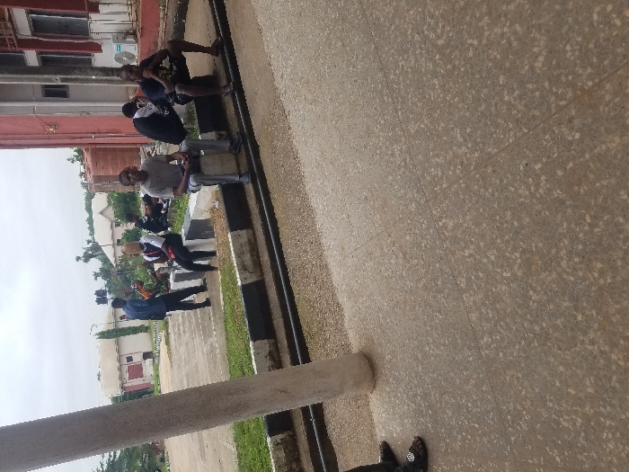 A group of people gathers outside a red building with air conditioning units, some sitting on a low wall marked with black and white stripes. Others stand nearby, with one person wearing a white jacket. A large column frames the foreground, extending toward a textured ground surface. The setting appears to be a campus or public area, with additional buildings and greenery visible in the background.