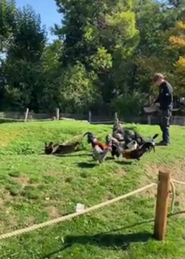 man in a black jacket and gray pants standing on a grassy area feeding chickens and roosters. There are about a dozen birds in the grass, pecking at food being scattered by the man. Behind the man and birds are trees. A rope fence is visible in the foreground. The sky is blue and the sun is shining.