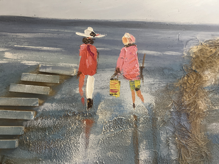 An impressionistic painting depicts two figures walking on a beach alongside textured elements