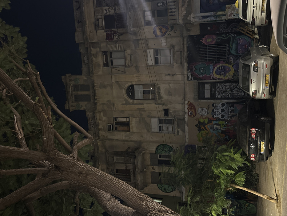 An aged, graffitied building stands next to parked cars on a dimly lit street. The building's facade shows wear, with multiple windows of varying sizes and shapes. Graffiti covers portions of the wall. A large tree with thick branches partially obscures the view of the building. Street lighting provides minimal illumination.