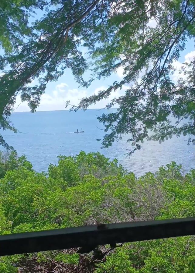 view of a calm blue ocean with a boat in the distance. The shot is partially framed by lush green trees and a metal railing. The sky is blue with some clouds. The water appears slightly rippled, and the boat leaves a small wake behind it.