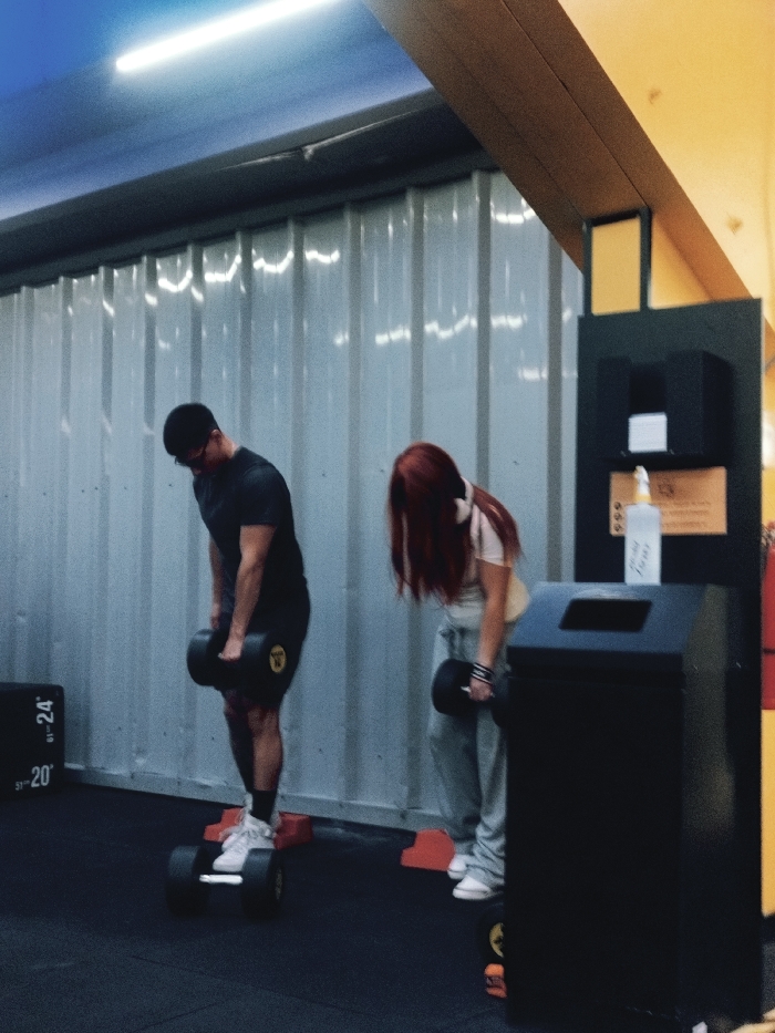 Two people are lifting weights in a gym. One person, a man wearing a black t-shirt and shorts, is standing on a platform and holding a dumbbell. The other person, a woman with long red hair, is holding a dumbbell and wearing a light-colored shirt and gray sweatpants. In the background is a gray metal wall. There is also a black trash can and a dispenser next to the woman. The gym has black floors and a light-colored ceiling.