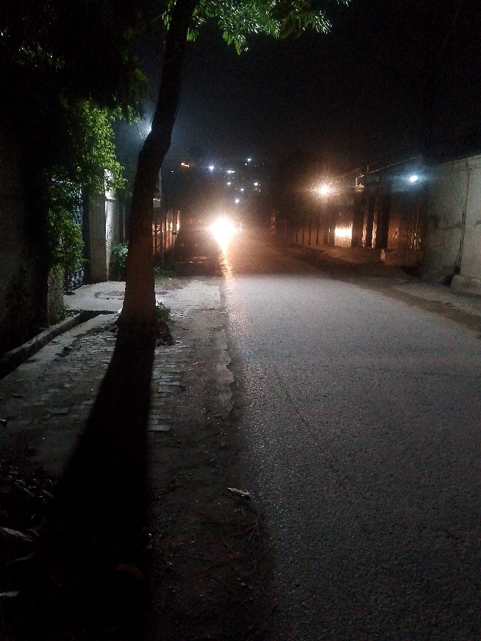 The image displays an urban street scene at night in Peshawar City Tehsil, Pakistan. A dark asphalt road, appearing damp or reflective, extends from the foreground into the distance. On the left, a prominent tree trunk stands in the mid-foreground, casting a long, dark shadow onto an irregular, possibly brick, sidewalk and unpaved ground. Foliage of the tree is visible in the upper left. A fence or wall runs along the left side, behind the tree. On the right side of the road, a continuous wall or building facade is present, illuminated by multiple artificial light sources which also highlight a series of vertical structures, possibly poles or architectural features. In the mid-distance, a bright white light, consistent with vehicle headlights, is visible, casting a luminous path on the wet road surface. Further in the background, numerous smaller, scattered artificial lights indicate a developed area. No individuals are present. The scene is entirely reliant on artificial illumination.