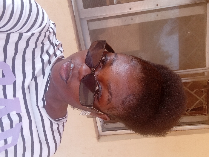 A woman wearing sunglasses and a striped shirt. She is looking up at the camera. The lighting in the image appears to be natural. The background appears to be a window with a light-colored frame. Her short afro hair is well-groomed. She is wearing dangling earrings. Her lips are glossy.