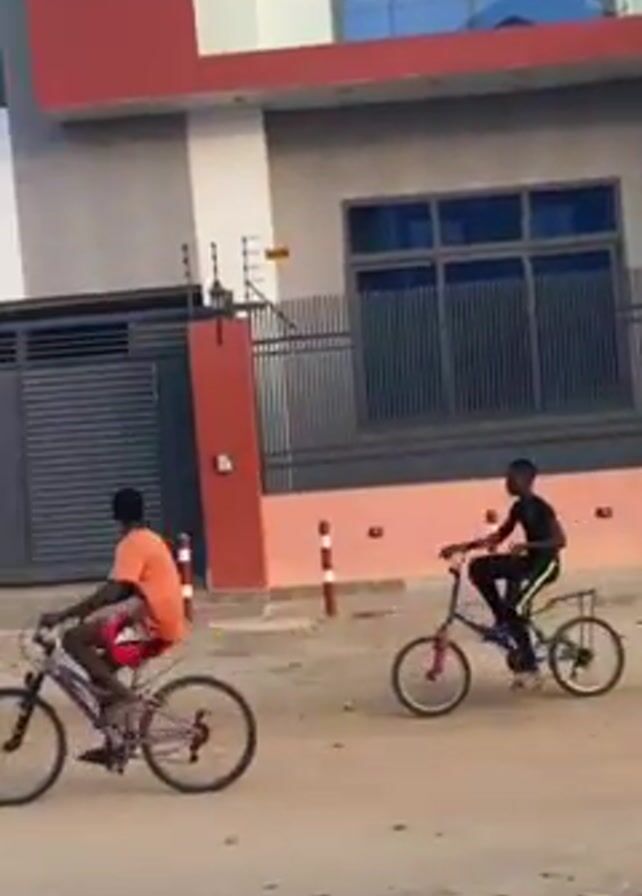The video depicts two young people riding bicycles on a dirt road in what appears to be a residential area. The person on the left wears an orange shirt and the one on the right wears black. They ride away from the camera, towards houses with fences and walls around them. The sky is light.
