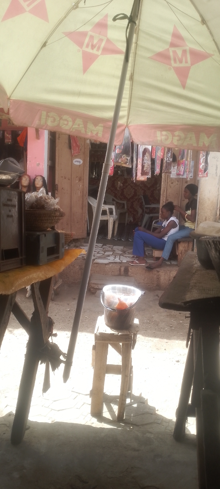 The image portrays an outdoor commercial scene in Katsina, Nigeria, near Muhammadu Dikko Stadium. A large, light-colored umbrella with red "M" logos and "MAGGI" branding (visible in reverse) provides shade in the foreground, supported by a central pole. Two young females are seated in the mid-ground. The female on the left wears a white top and blue pants, sitting on a low surface. The female on the right, in a dark top and light blue jeans, sits on a wooden bench, actively braiding or styling the hair of the first individual. To the left foreground, a wooden table supports dark, rectangular objects and a woven basket containing items in clear plastic bags. Behind this table, two mannequin heads with dark hair are visible. Directly beneath the umbrella, a clear plastic bucket containing a reddish-brown substance rests on a small wooden stool. The background features the entrance to a shop, characterized by a partially open wooden door with a white label reading "LIFTING." Inside the shop, white plastic chairs are visible, and numerous packaged hair extensions hang from an overhead support. A patterned reddish fabric is also visible within the shop's interior. The ground surface in the foreground is unpaved, transitioning to a patterned tiled area near the shop entrance. Strong sunlight creates distinct shadows, indicating an outdoor, daytime setting. The adjacent shop wall to the left appears to be painted a pinkish hue.